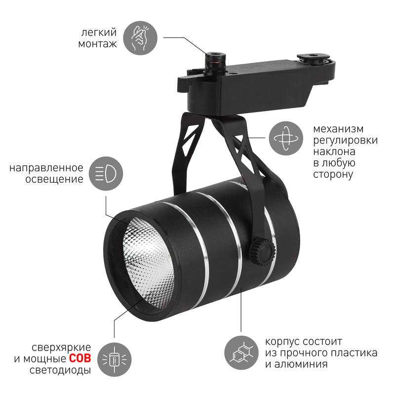 Характеристики Трековый светильник однофазный ЭРА TR3 — 10 BK светодиодный COB 10Вт 4000К 700Лм черный: