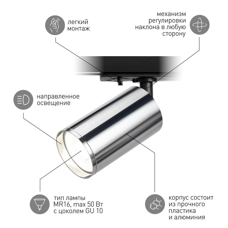 Однофазный трековый светильник под лампу GU10. Особенностью модели является современный утопленный трековый адаптер, который скрыт в шинопроводе и не отвлекает на себя внимание. Также модель комплектуется "Г" образным держателем, который визуально приближает светильник к шинопроводу, делая его эстетически более привлекательным. На тыльной части светильник имеет вентиляционные прорези для отвода горячего воздуха. Максимальная мощность лампы не должна превышать 15W.