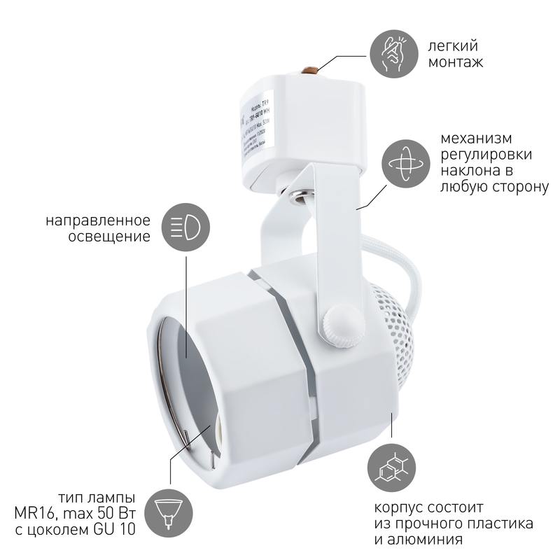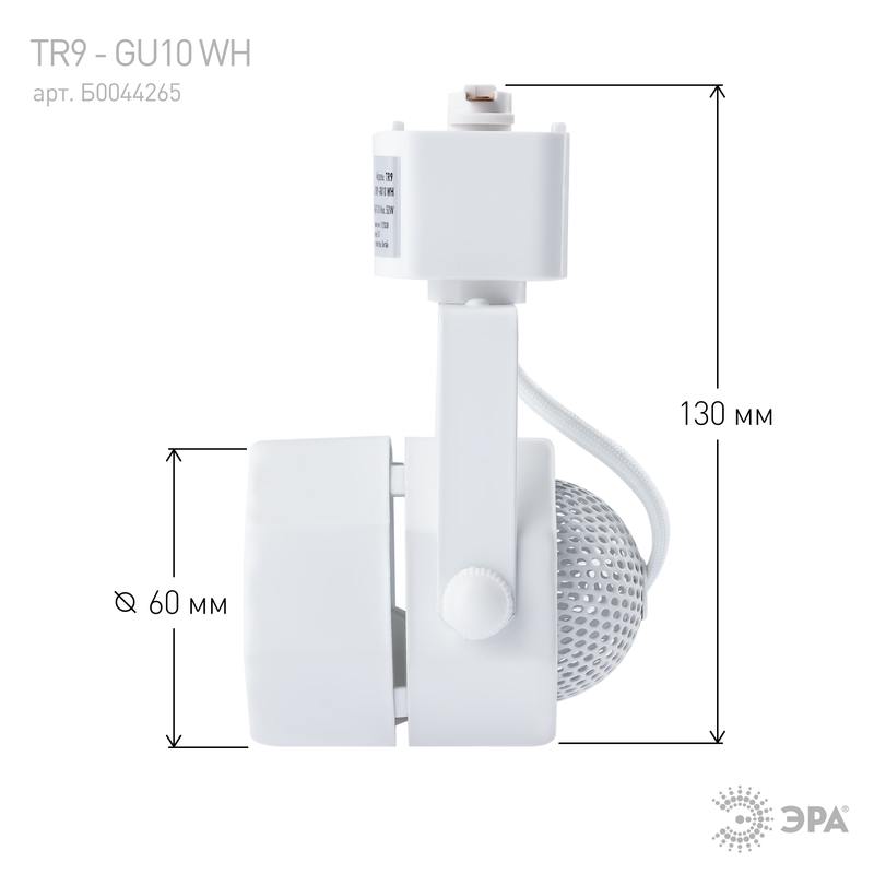 Характеристики Трековый светильник однофазный ЭРА TR9-GU10 WH под лампу MR16 белый: