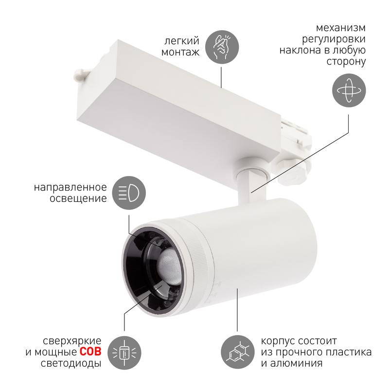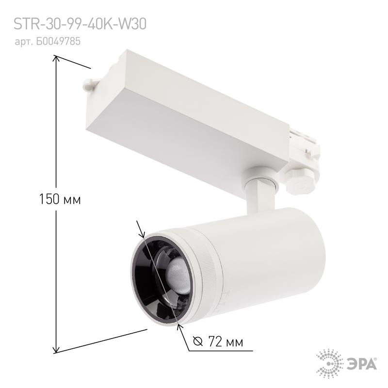 Характеристики Трековый светильник трехфазный ЭРА STR-30-99-40K-W30 регулируемый луч 4000K белый: