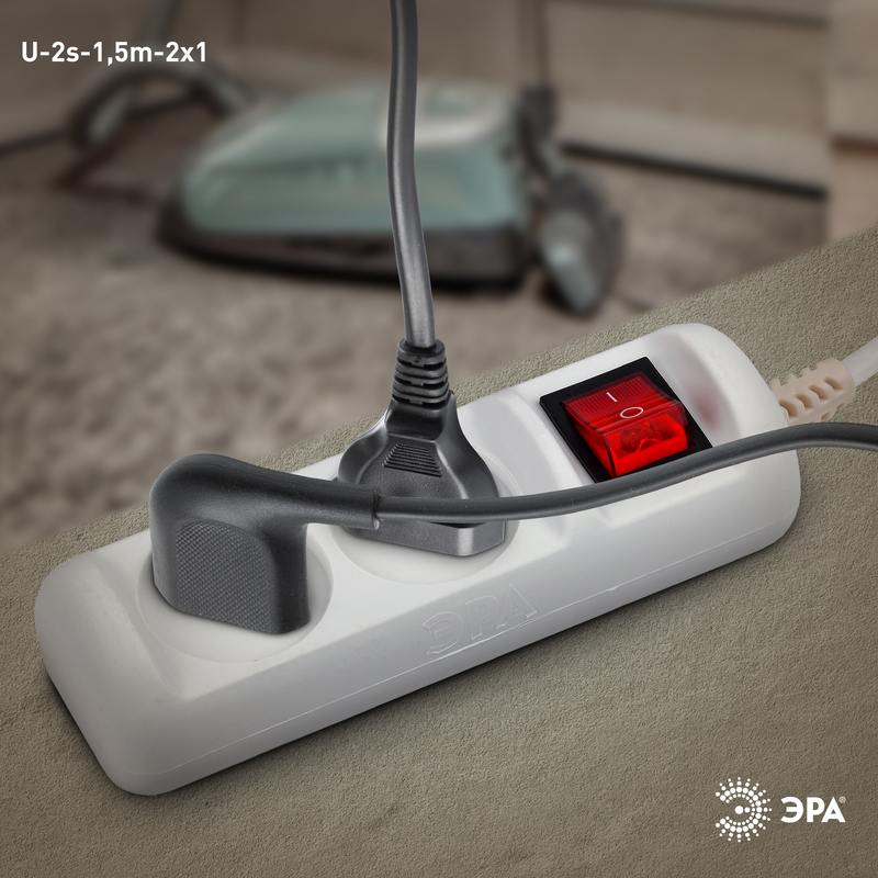 Характеристики Удлинитель электрический ЭРА U-2s-1,5m-2×1 без заземления c выключателем 2 розетки 1,5м ПВС 2×1мм2 10А: