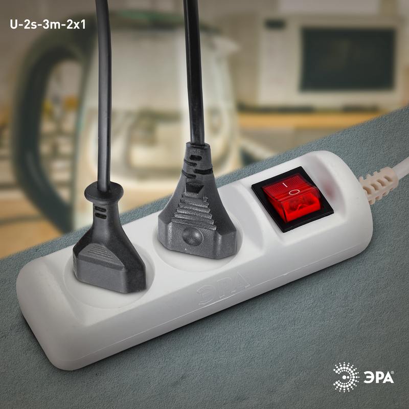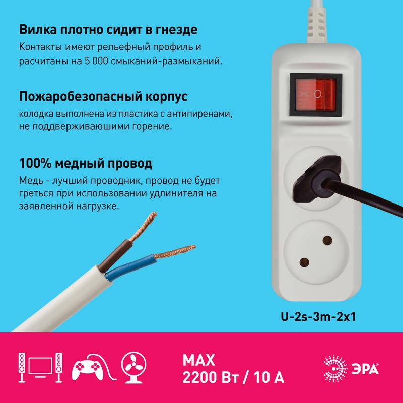 Удлинитель электрический Эра U-2s-3m-2×1 без заземления, с выключателем, ПВС, 2×1мм2, 2 розетки, 3м. Рассчитан на максимальную мощность 10А/2200 Вт. Удлинитель Эра станет Вашим надежным помощником, если Ваши любимые электроприборы находятся далеко от розеток. Провод в удлинителях Эра сделан из 100% меди, что делает его абсолютно пожаробезопасным. Корпус выполнен из ударопрочного и негорючего пластика (полипропилен). Модель удлинителя на 10А позволяет подключить бытовые приборы общей нагрузкой до 2200Вт. Дизайн удлинителя разработан в России командой Эра Style.