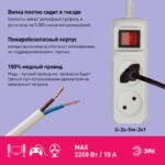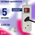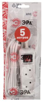 Удлинитель электрический Эра U-2s-3m-2×1 без заземления, с выключателем, ПВС, 2×1мм2, 2 розетки, 5м. Рассчитан на максимальную мощность 10А/2200 Вт. Удлинитель Эра станет Вашим надежным помощником, если Ваши любимые электроприборы находятся далеко от розеток. Провод в удлинителях Эра сделан из 100% меди, что делает его абсолютно пожаробезопасным. Корпус выполнен из ударопрочного и негорючего пластика (полипропилен). Модель удлинителя на 10А позволяет подключить бытовые приборы общей нагрузкой до 2200Вт. Дизайн удлинителя разработан в России командой Эра Style.