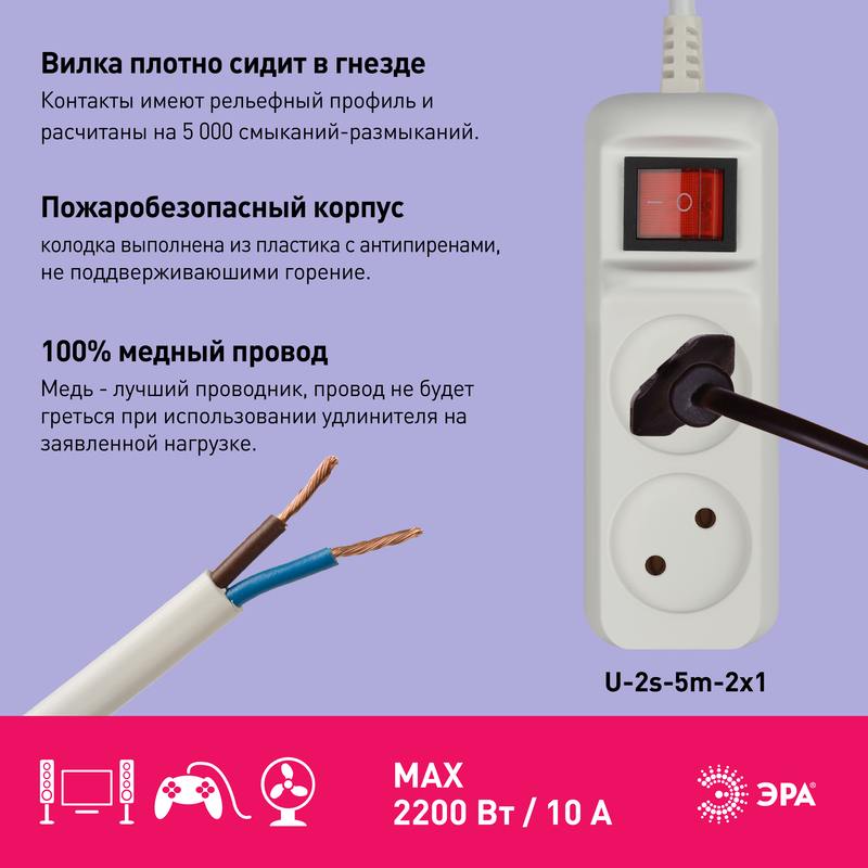 Удлинитель электрический Эра U-2s-3m-2×1 без заземления, с выключателем, ПВС, 2×1мм2, 2 розетки, 5м. Рассчитан на максимальную мощность 10А/2200 Вт. Удлинитель Эра станет Вашим надежным помощником, если Ваши любимые электроприборы находятся далеко от розеток. Провод в удлинителях Эра сделан из 100% меди, что делает его абсолютно пожаробезопасным. Корпус выполнен из ударопрочного и негорючего пластика (полипропилен). Модель удлинителя на 10А позволяет подключить бытовые приборы общей нагрузкой до 2200Вт. Дизайн удлинителя разработан в России командой Эра Style.