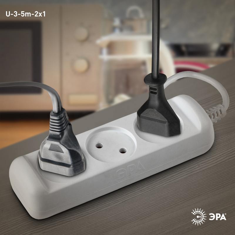 Удлинитель электрический Эра U-3-5m без заземления, ПВС, 2×1мм2, 2 розетки, 5м. Рассчитан на максимальную мощность 10А/2200 Вт. Удлинитель Эра станет Вашим надежным помощником, если Ваши любимые электроприборы находятся далеко от розеток. Провод в удлинителях Эра сделан из 100% меди, что делает его абсолютно пожаробезопасным. Корпус выполнен из ударопрочного и негорючего пластика (полипропилен). В моделях с заземлением у вилки есть кольцо для удобного извлечения из розетки. Модель удлинителя на 10А позволяет подключить мощные бытовые приборы общей нагрузкой до 2200Вт. Не бойтесь включить чайник, обогреватель, микроволновку или другие электроприборы. Толстый провод удлинителя Эра гарантирует полную безопасность. Дизайн удлинителя разработан в России командой Эра Style.