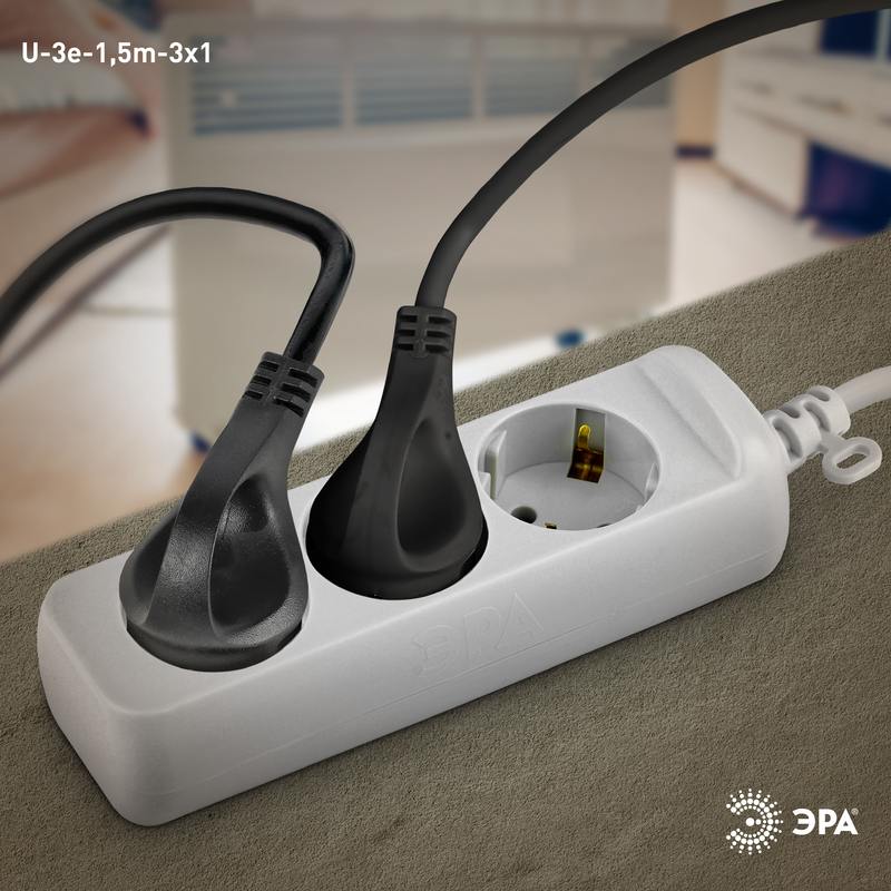 Удлинитель электрический Эра U-3e-1,5m с заземлением, ПВС, 3×1мм2, 3 розетки, 1,5м. Рассчитан на максимальную мощность 16А/3500 Вт. Удлинитель Эра станет Вашим надежным помощником, если Ваши любимые электроприборы находятся далеко от розеток. Провод в удлинителях Эра сделан из 100% меди, что делает его абсолютно пожаробезопасным. Корпус выполнен из ударопрочного и негорючего пластика (полипропилен). В моделях с заземлением у вилки есть кольцо для удобного извлечения из розетки. Модель удлинителя на 16А позволяет подключить мощные бытовые приборы общей нагрузкой до 3500Вт. Не бойтесь включить чайник, обогреватель, микроволновку или другие электроприборы. Толстый провод удлинителя Эра гарантирует полную безопасность. Дизайн удлинителя разработан в России командой Эра Style.