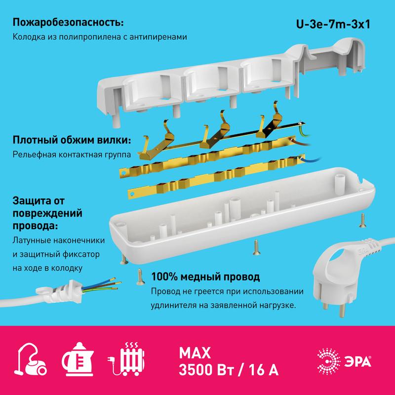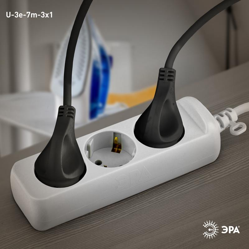Удлинитель электрический Эра U-3e-7m-3×1 с заземлением, ПВС, 3×1мм2, 3 розетки, 7м. Рассчитан на максимальную мощность 16А/3500 Вт. Удлинитель Эра станет Вашим надежным помощником, если Ваши любимые электроприборы находятся далеко от розеток. Провод в удлинителях Эра сделан из 100% меди, что делает его абсолютно пожаробезопасным. Корпус выполнен из ударопрочного и негорючего пластика (полипропилен). В моделях с заземлением у вилки есть кольцо для удобного извлечения из розетки. Модель удлинителя на 16А позволяет подключить мощные бытовые приборы общей нагрузкой до 3500Вт. Не бойтесь включить чайник, обогреватель, микроволновку или другие электроприборы. Толстый провод удлинителя Эра гарантирует полную безопасность. Дизайн удлинителя разработан в России командой Эра Style.