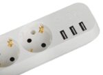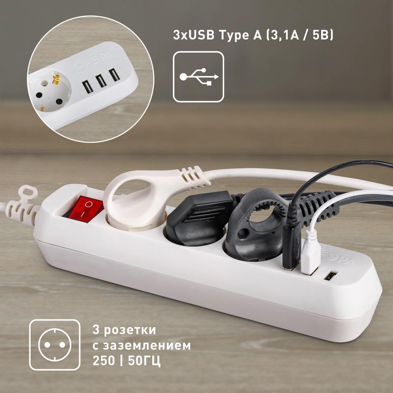 Удлинитель электрический ЭРА U-3es-1,5m-USB с заземлением, с выключателем, 3 розетки, 1,5м ПВС 3×0,75мм2. Рассчитан на максимальную мощность 10А/2200Вт. С 3-мя USB гнездами (Type A) для зарядки портативных устройств. Максимальная мощность USB разъемов: 3100 мА.