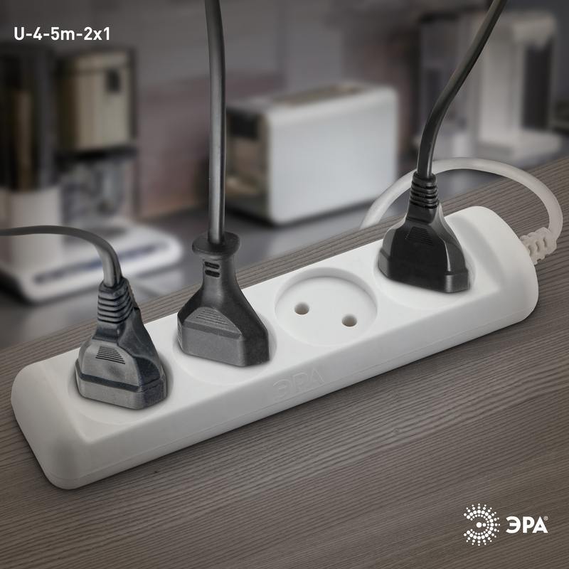 Удлинитель электрический Эра U-4-5m без заземления, ПВС, 2×1мм2, 4 розетки, 5м. Рассчитан на максимальную мощность 10А/2200 Вт. Удлинитель Эра станет Вашим надежным помощником, если Ваши любимые электроприборы находятся далеко от розеток. Провод в удлинителях Эра сделан из 100% меди, что делает его абсолютно пожаробезопасным. Корпус выполнен из ударопрочного и негорючего пластика (полипропилен). В моделях с заземлением у вилки есть кольцо для удобного извлечения из розетки. Модель удлинителя на 10А позволяет подключить мощные бытовые приборы общей нагрузкой до 2200Вт. Не бойтесь включить чайник, обогреватель, микроволновку или другие электроприборы. Толстый провод удлинителя Эра гарантирует полную безопасность. Дизайн удлинителя разработан в России командой Эра Style.