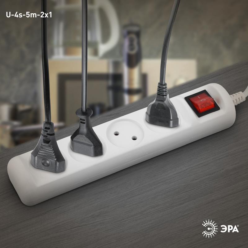 Удлинитель электрический Эра U-4s-5m-2×1 без заземления, с выключателем, ПВС, 2×1мм2, 4 розетки, 5 м. Рассчитан на максимальную мощность 10А/2200 Вт. Удлинитель Эра станет Вашим надежным помощником, если Ваши любимые электроприборы находятся далеко от розеток. Провод в удлинителях Эра сделан из 100% меди, что делает его абсолютно пожаробезопасным. Корпус выполнен из ударопрочного и негорючего пластика (полипропилен). Модель удлинителя на 10А позволяет подключить бытовые приборы общей нагрузкой до 2200Вт. Дизайн удлинителя разработан в России командой Эра Style.