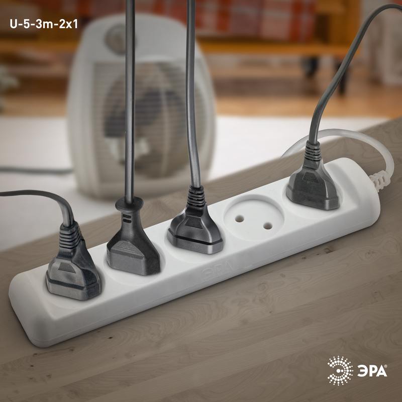Удлинитель электрический Эра U-5-3m без заземления, ПВС, 2×1мм2, 5 розеток, 3м. Рассчитан на максимальную мощность 10А/2200 Вт. Удлинитель Эра станет Вашим надежным помощником, если Ваши любимые электроприборы находятся далеко от розеток. Провод в удлинителях Эра сделан из 100% меди, что делает его абсолютно пожаробезопасным. Корпус выполнен из ударопрочного и негорючего пластика (полипропилен). В моделях с заземлением у вилки есть кольцо для удобного извлечения из розетки. Модель удлинителя на 10А позволяет подключить мощные бытовые приборы общей нагрузкой до 2200Вт. Не бойтесь включить чайник, обогреватель, микроволновку или другие электроприборы. Толстый провод удлинителя Эра гарантирует полную безопасность. Дизайн удлинителя разработан в России командой Эра Style.