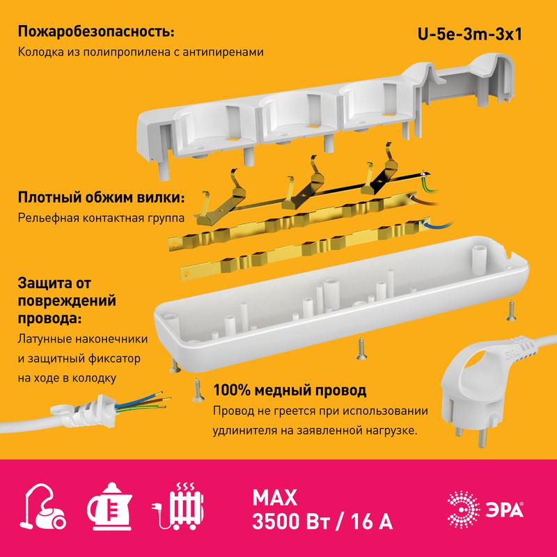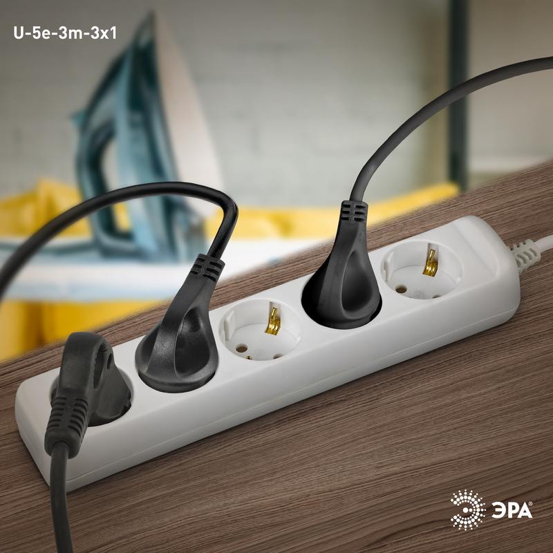 Удлинитель электрический Эра U-5e-3m-3×1 с заземлением, ПВС, 3×1мм2, 5 розеток, 3 м. Рассчитан на максимальную мощность 16А/3500 Вт. Удлинитель Эра станет Вашим надежным помощником, если Ваши любимые электроприборы находятся далеко от розеток. Провод в удлинителях Эра сделан из 100% меди, что делает его абсолютно пожаробезопасным. Корпус выполнен из ударопрочного и негорючего пластика (полипропилен). В моделях с заземлением у вилки есть кольцо для удобного извлечения из розетки. Модель удлинителя на 16А позволяет подключить мощные бытовые приборы общей нагрузкой до 3500Вт. Не бойтесь включить чайник, обогреватель, микроволновку или другие электроприборы. Толстый провод удлинителя Эра гарантирует полную безопасность. Дизайн удлинителя разработан в России командой Эра Style.