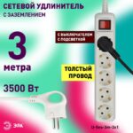 Удлинитель электрический Эра U-5es-3m-3×1 с заземлением, с выключателем, ПВС, 3×1мм2, 5 розетки, 3 м. Рассчитан на максимальную мощность 16А/3500 Вт. Удлинитель Эра станет Вашим надежным помощником, если Ваши любимые электроприборы находятся далеко от розеток. Провод в удлинителях Эра сделан из 100% меди, что делает его абсолютно пожаробезопасным. Корпус выполнен из ударопрочного и негорючего пластика (полипропилен). В моделях с заземлением у вилки есть кольцо для удобного извлечения из розетки. Модель удлинителя на 16А позволяет подключить мощные бытовые приборы общей нагрузкой до 3500Вт. Не бойтесь включить чайник, обогреватель, микроволновку или другие электроприборы. Толстый провод удлинителя Эра гарантирует полную безопасность. Дизайн удлинителя разработан в России командой Эра Style.