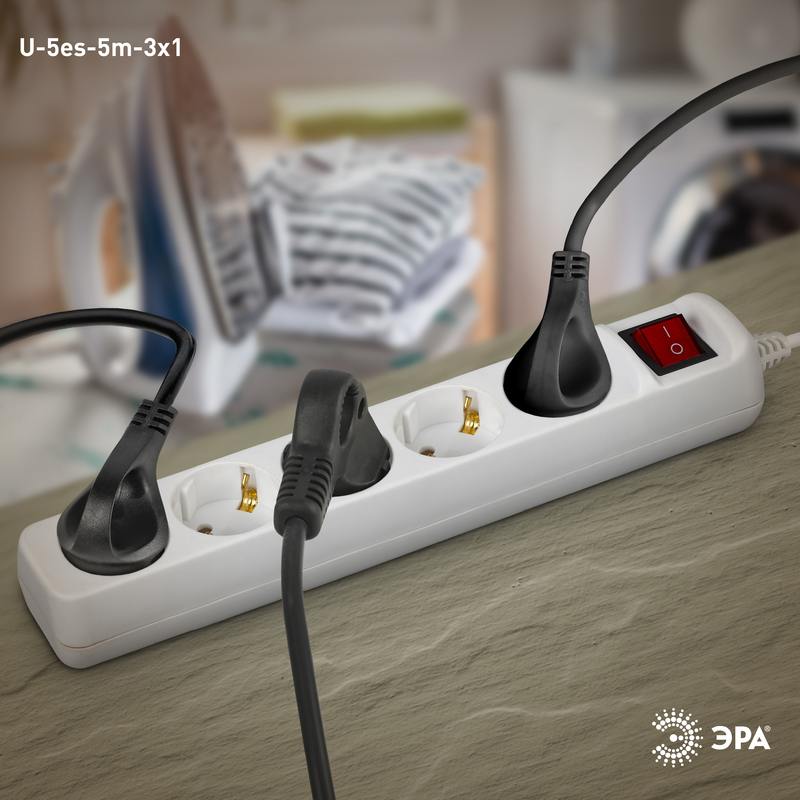 Удлинитель электрический Эра U-5es-5m-3×1 с заземлением, с выключателем, ПВС, 3×1мм2, 5 розетки, 5 м. Рассчитан на максимальную мощность 16А/3500 Вт. Удлинитель Эра станет Вашим надежным помощником, если Ваши любимые электроприборы находятся далеко от розеток. Провод в удлинителях Эра сделан из 100% меди, что делает его абсолютно пожаробезопасным. Корпус выполнен из ударопрочного и негорючего пластика (полипропилен). В моделях с заземлением у вилки есть кольцо для удобного извлечения из розетки. Модель удлинителя на 16А позволяет подключить мощные бытовые приборы общей нагрузкой до 3500Вт. Не бойтесь включить чайник, обогреватель, микроволновку или другие электроприборы. Толстый провод удлинителя Эра гарантирует полную безопасность. Дизайн удлинителя разработан в России командой Эра Style.