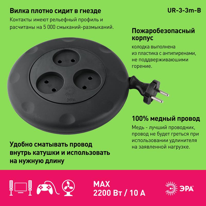 Удлинитель электрический рулетка Эра UR-3-3m-B без заземления, ШВВП, 2×0,75мм2, 3 розетки, 3 м. Рассчитан на максимальную мощность 10А/2200. Удлинитель Эра станет Вашим надежным помощником, если Ваши любимые электроприборы находятся далеко от розеток. Провод в удлинителях Эра сделан из 100% меди, что делает его абсолютно пожаробезопасным. Корпус выполнен из ударопрочного и негорючего пластика (полипропилен). .
