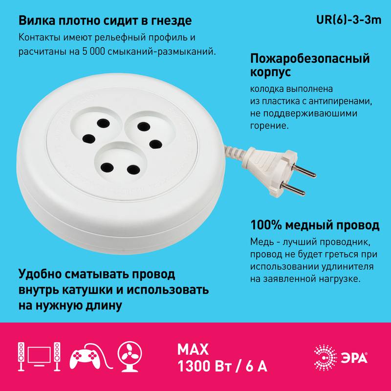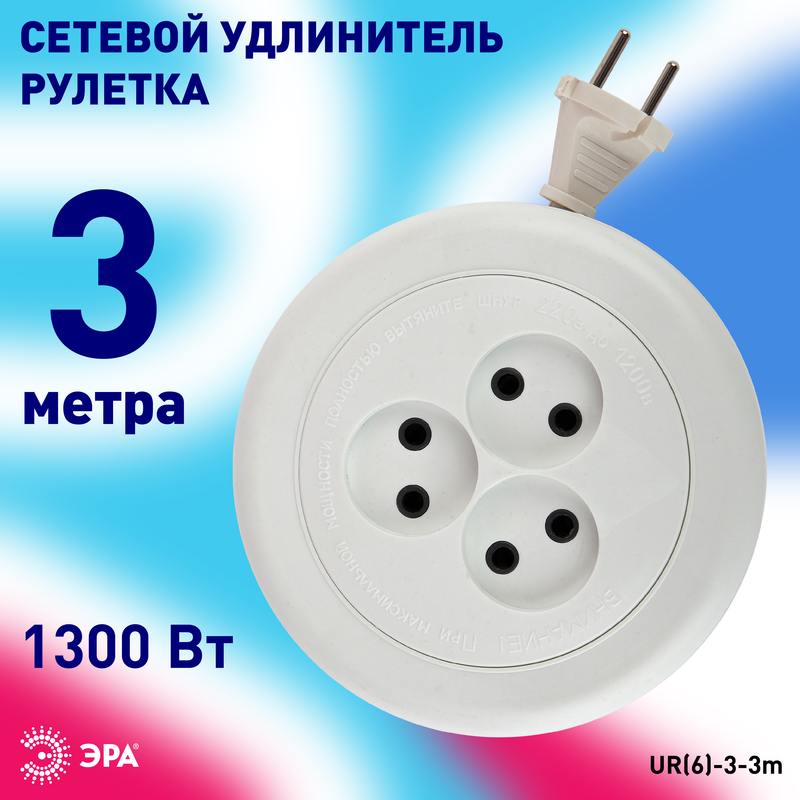 Характеристики Удлинитель электрический ЭРА UR-3-3m рулетка без заземления 3 розетки 3м ШВВП 2×0,75мм2 6А:
