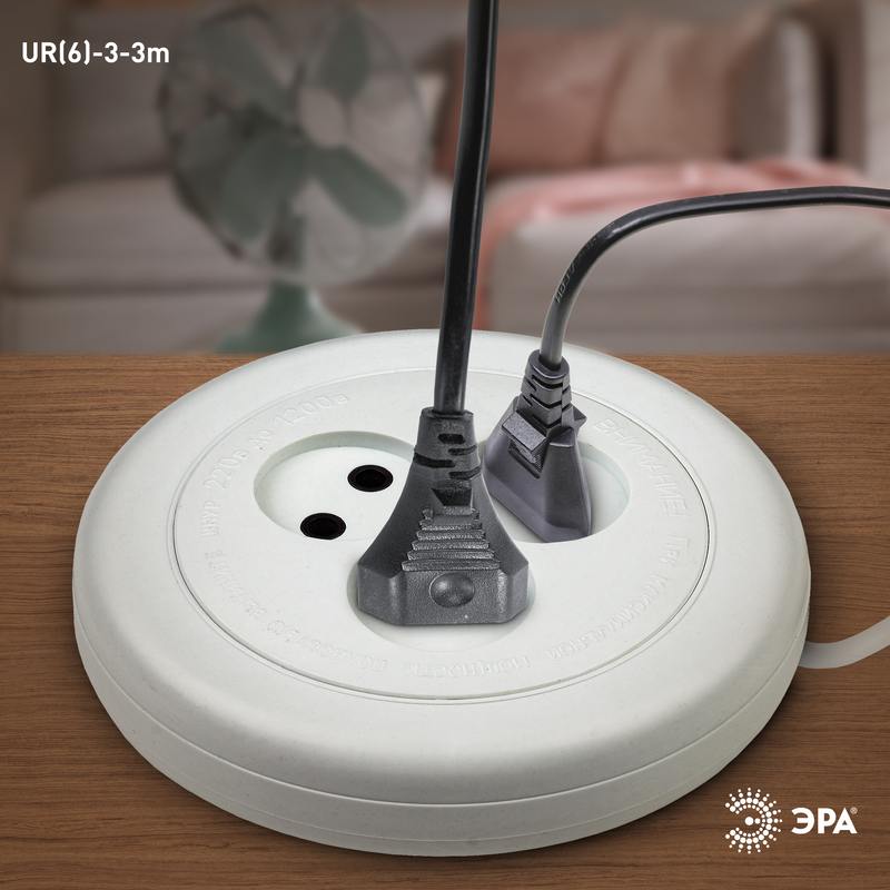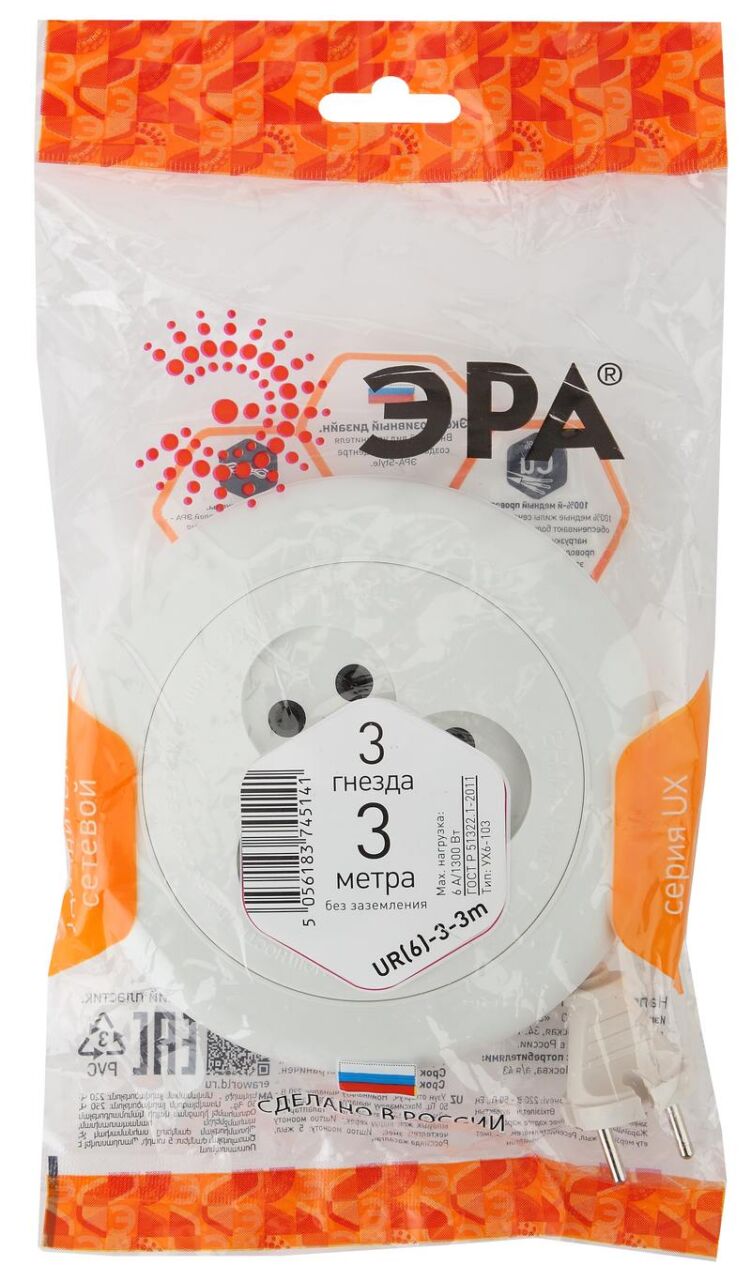 Удлинитель ЭРА серии UX без заземления: провод ШВВП 2×0.75мм2, корпус — ABS-пластик, негорючие вставки из армлена, максимальная нагрузка — 6A/1300Вт
