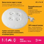 Удлинитель электрический рулетка Эра UR-4-7m-W без заземления, ШВВП, 2×1мм2, 4 розетки, 7 м. Рассчитан на максимальную мощность 10А/2200 Вт. Удлинитель Эра станет Вашим надежным помощником, если Ваши любимые электроприборы находятся далеко от розеток. Провод в удлинителях Эра сделан из 100% меди, что делает его абсолютно пожаробезопасным. Корпус выполнен из ударопрочного и негорючего пластика (полипропилен). В моделях с заземлением у вилки есть кольцо для удобного извлечения из розетки. Подходит для подключения приборов средней мощности: TV, компьютерная периферия, осветительные приборы. Дизайн удлинителя разработан в России командой Эра Slyle. Дизайн удлинителя разработан в России командой Эра Style.