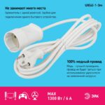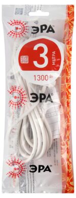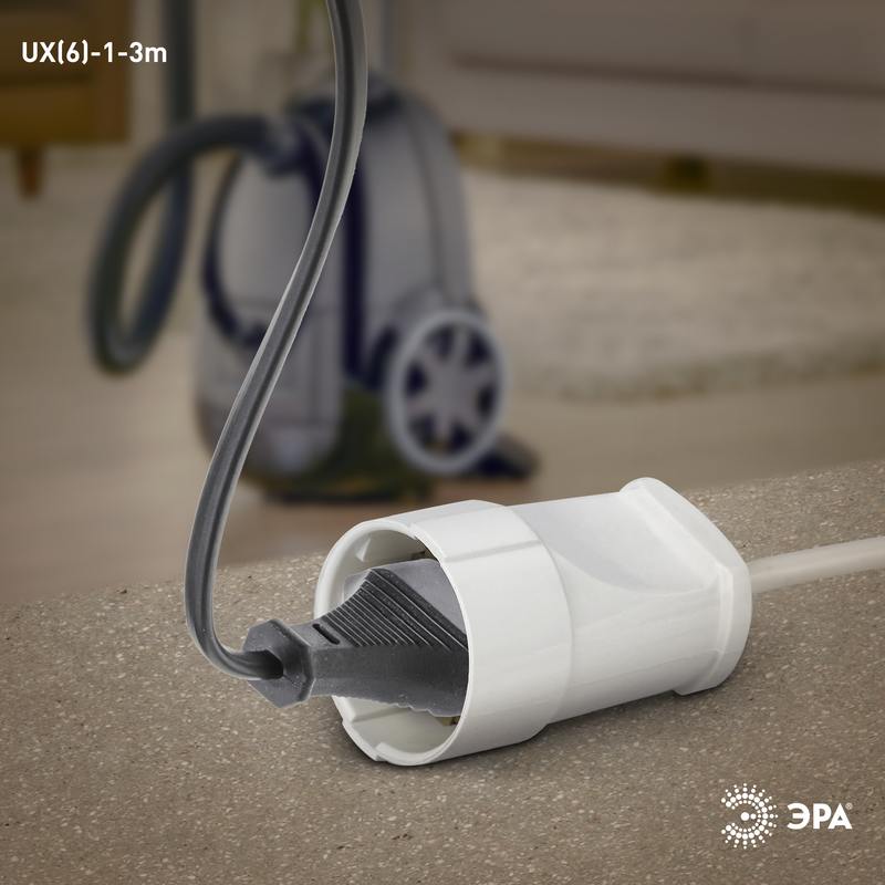Удлинитель электрический Эра UX(6)-1-3m без заземления, 1 розетка, провод ПВС 2×0,75мм2 длиной 3 м. Рассчитан на максимальную мощность 6А/1300Вт. Удлинитель Эра станет Вашим надежным помощником, если Ваши любимые электроприборы находятся далеко от розеток. Модель удлинителя на 6А позволяет подключить бытовые приборы общей нагрузкой до 1300Вт. Дизайн удлинителя разработан в России командой Эра Style.