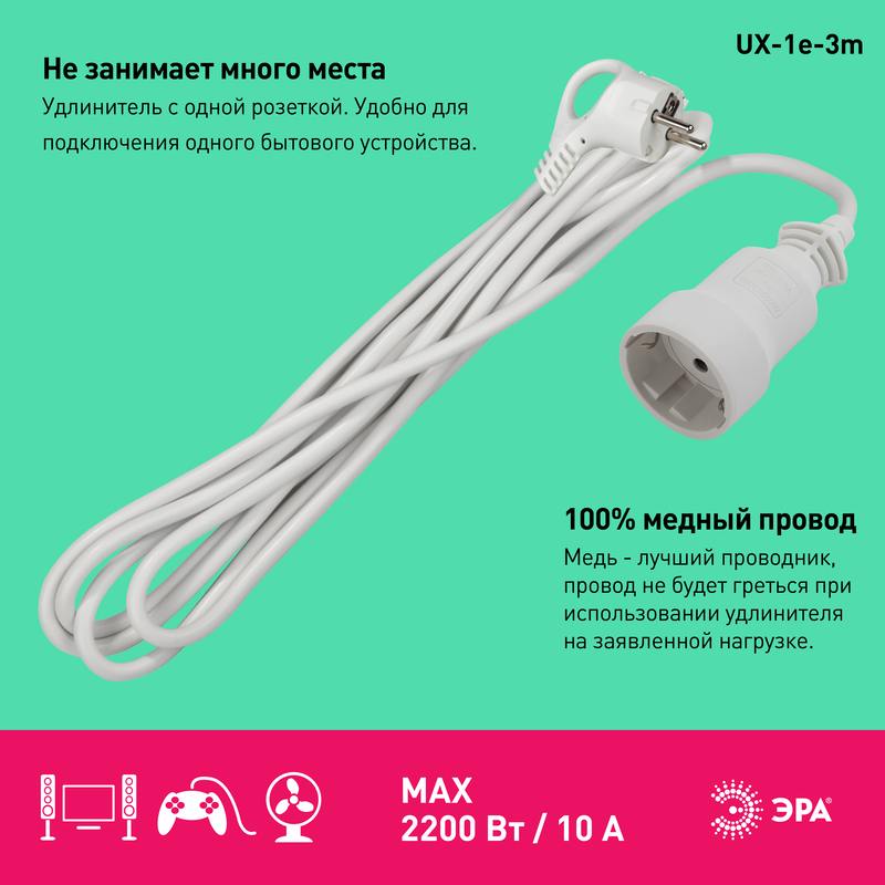 Удлинитель электрический Эра UX-1е-3m с заземлением,1 розетка, провод ПВС 3×0,75мм2, 3 м. Рассчитан на максимальную мощность 10А/2200 Вт. Удлинитель Эра станет Вашим надежным помощником, если Ваши любимые электроприборы находятся далеко от розеток. Провод в удлинителях Эра сделан из 100% меди, что делает его абсолютно пожаробезопасным. Корпус выполнен из ударопрочного и негорючего пластика (полипропилен). Вилка обеспечена кольцом для удобного извлечения ее из розетки. Модель удлинителя на 10А позволяет подключить бытовые приборы общей нагрузкой до 2200Вт. Дизайн удлинителя разработан в России командой Эра Style.