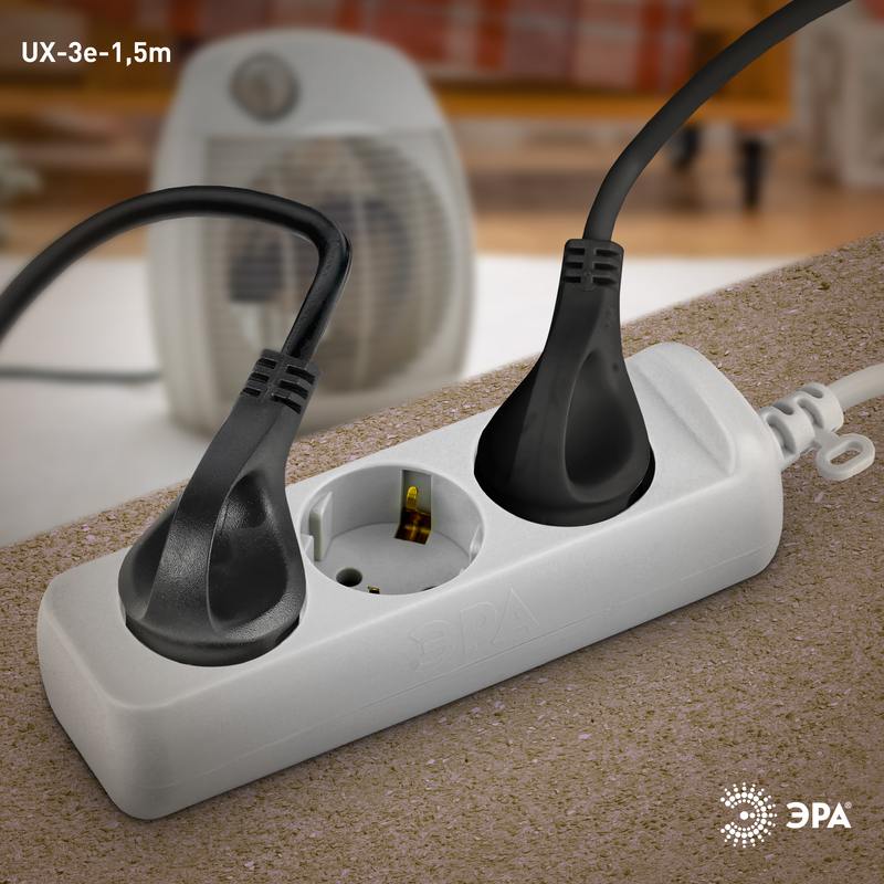 Удобный в применении бытовой удлинитель ЭРА UX-3e-1,5m с заземлением и удобной вилкой с кольцом. Длина шнура- 1,5 метра, 3 розетки. Позволяет подключать электроприборы с максимальной нагрузкой 10 А/ 2200 Вт. Этот надёжный и безопасный удлинитель изготовлен из негорючих материалов и имеет трёхжильный медный провод ПВС.