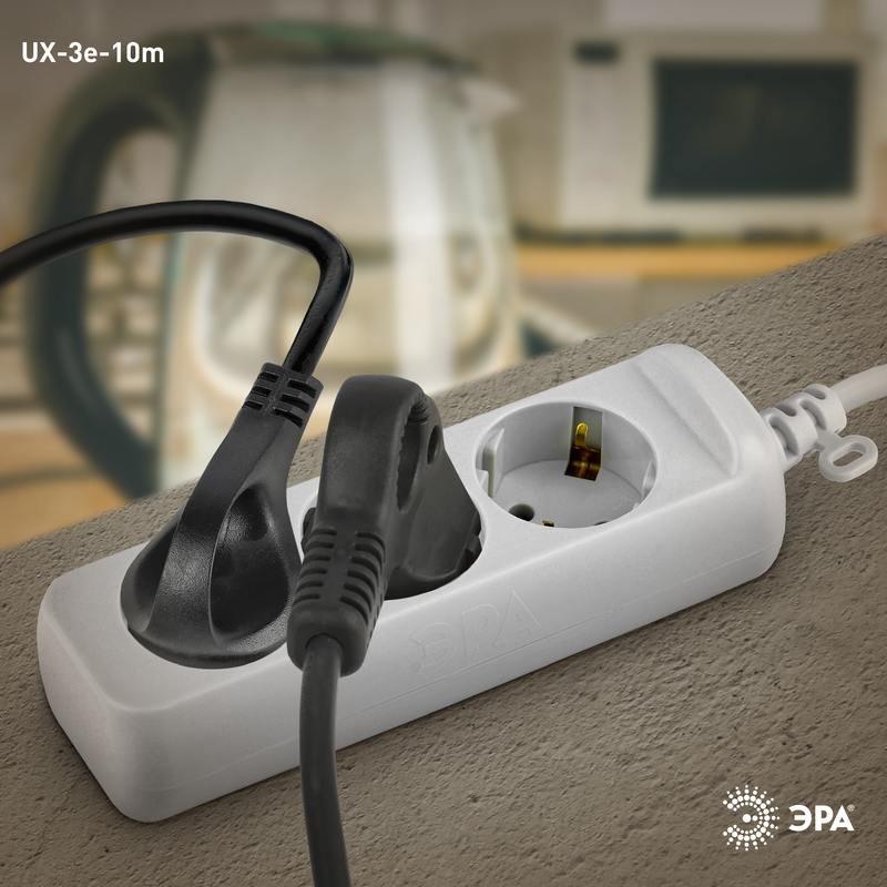 Удлинитель электрический Эра UX-3e-10m с заземлением, ПВС, 3×0,75мм2, 3 розетки, 10 м. Рассчитан на максимальную мощность 10А/2200 Вт. Удлинитель Эра станет Вашим надежным помощником, если Ваши любимые электроприборы находятся далеко от розеток. Провод в удлинителях Эра сделан из 100% меди, что делает его абсолютно пожаробезопасным. Корпус выполнен из ударопрочного и негорючего пластика (полипропилен). Вилка обеспечена кольцом для удобного извлечения ее из розетки. Модель удлинителя на 10А позволяет подключить бытовые приборы общей нагрузкой до 2200Вт. Дизайн удлинителя разработан в России командой Эра Style.
