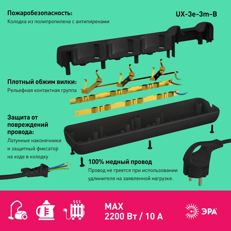 Удлинитель электрический Эра UX-3e-3m-B с заземлением, черный, 3 розетки. Провод ПВС, 3×0,75мм2, 3 м. Рассчитан на максимальную мощность 10А/2200 Вт. Удлинитель Эра станет Вашим надежным помощником, если Ваши любимые электроприборы находятся далеко от розеток. Провод в удлинителях Эра сделан из 100% меди, что делает его абсолютно пожаробезопасным. Корпус выполнен из ударопрочного и негорючего пластика (полипропилен). Вилка обеспечена кольцом для удобного извлечения ее из розетки. Модель удлинителя на 10А позволяет подключить бытовые приборы общей нагрузкой до 2200Вт. Дизайн удлинителя разработан в России командой Эра Style.