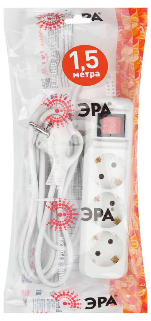 Удлинитель электрический Эра UX-3es-1,5m с заземлением, с выключателем, белый, 3 розетки. Провод ПВС, 3×0,75мм2, 1,5 м. Рассчитан на максимальную мощность 10А/2200 Вт. Удлинитель Эра станет Вашим надежным помощником, если Ваши любимые электроприборы находятся далеко от розеток. Провод в удлинителях Эра сделан из 100% меди, что делает его абсолютно пожаробезопасным. Корпус выполнен из ударопрочного и негорючего пластика (полипропилен). Вилка обеспечена кольцом для удобного извлечения ее из розетки. Модель удлинителя на 10А позволяет подключить бытовые приборы общей нагрузкой до 2200Вт. Дизайн удлинителя разработан в России командой Эра Style.