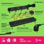 Удлинитель электрический Эра UX-3es-5m-B с заземлением, с выключателем, черный, 5 розетки. Провод ПВС, 3×0,75мм2, 5м. Рассчитан на максимальную мощность 10А/2200 Вт. Удлинитель Эра станет Вашим надежным помощником, если Ваши любимые электроприборы находятся далеко от розеток. Провод в удлинителях Эра сделан из 100% меди, что делает его абсолютно пожаробезопасным. Корпус выполнен из ударопрочного и негорючего пластика (полипропилен). Вилка обеспечена кольцом для удобного извлечения ее из розетки. Модель удлинителя на 10А позволяет подключить бытовые приборы общей нагрузкой до 2200Вт. Дизайн удлинителя разработан в России командой Эра Style.