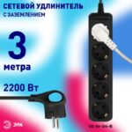 Удлинитель электрический Эра UX-5e-3m-B с заземлением, черный, 5 розеток. Провод ПВС, 3×0,75мм2, 3 м. Рассчитан на максимальную мощность 10А/2200 Вт. Удлинитель Эра станет Вашим надежным помощником, если Ваши любимые электроприборы находятся далеко от розеток. Провод в удлинителях Эра сделан из 100% меди, что делает его абсолютно пожаробезопасным. Корпус выполнен из ударопрочного и негорючего пластика (полипропилен). Вилка обеспечена кольцом для удобного извлечения ее из розетки. Модель удлинителя на 10А позволяет подключить бытовые приборы общей нагрузкой до 2200Вт. Дизайн удлинителя разработан в России командой Эра Style.