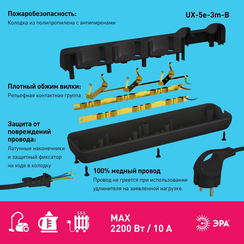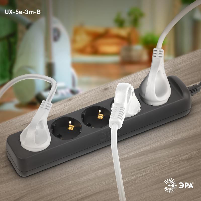 Удлинитель электрический Эра UX-5e-3m-B с заземлением, черный, 5 розеток. Провод ПВС, 3×0,75мм2, 3 м. Рассчитан на максимальную мощность 10А/2200 Вт. Удлинитель Эра станет Вашим надежным помощником, если Ваши любимые электроприборы находятся далеко от розеток. Провод в удлинителях Эра сделан из 100% меди, что делает его абсолютно пожаробезопасным. Корпус выполнен из ударопрочного и негорючего пластика (полипропилен). Вилка обеспечена кольцом для удобного извлечения ее из розетки. Модель удлинителя на 10А позволяет подключить бытовые приборы общей нагрузкой до 2200Вт. Дизайн удлинителя разработан в России командой Эра Style.