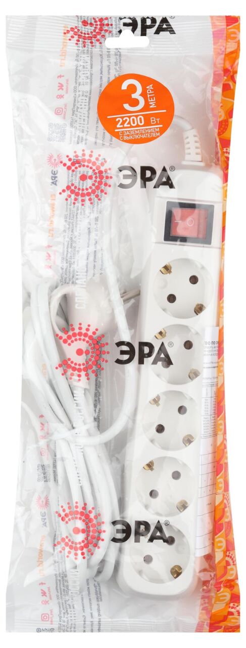 Удлинитель электрический Эра UX-5es-3m с заземлением, с выключателем, ПВС, 3×0,75мм2, 5 розеток, 3 м. Рассчитан на максимальную мощность 10А/2200 Вт. Удлинитель Эра станет Вашим надежным помощником, если Ваши любимые электроприборы находятся далеко от розеток. Провод в удлинителях Эра сделан из 100% меди, что делает его абсолютно пожаробезопасным. Корпус выполнен из ударопрочного и негорючего пластика (полипропилен). Вилка обеспечена кольцом для удобного извлечения ее из розетки. Модель удлинителя на 10А позволяет подключить бытовые приборы общей нагрузкой до 2200Вт. Дизайн удлинителя разработан в России командой Эра Style.