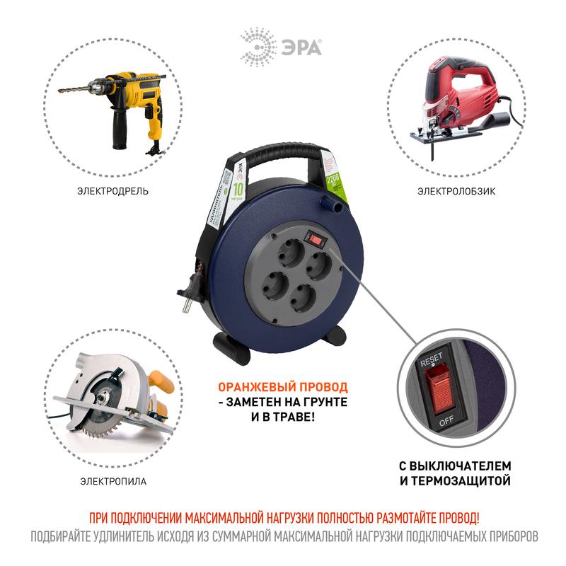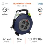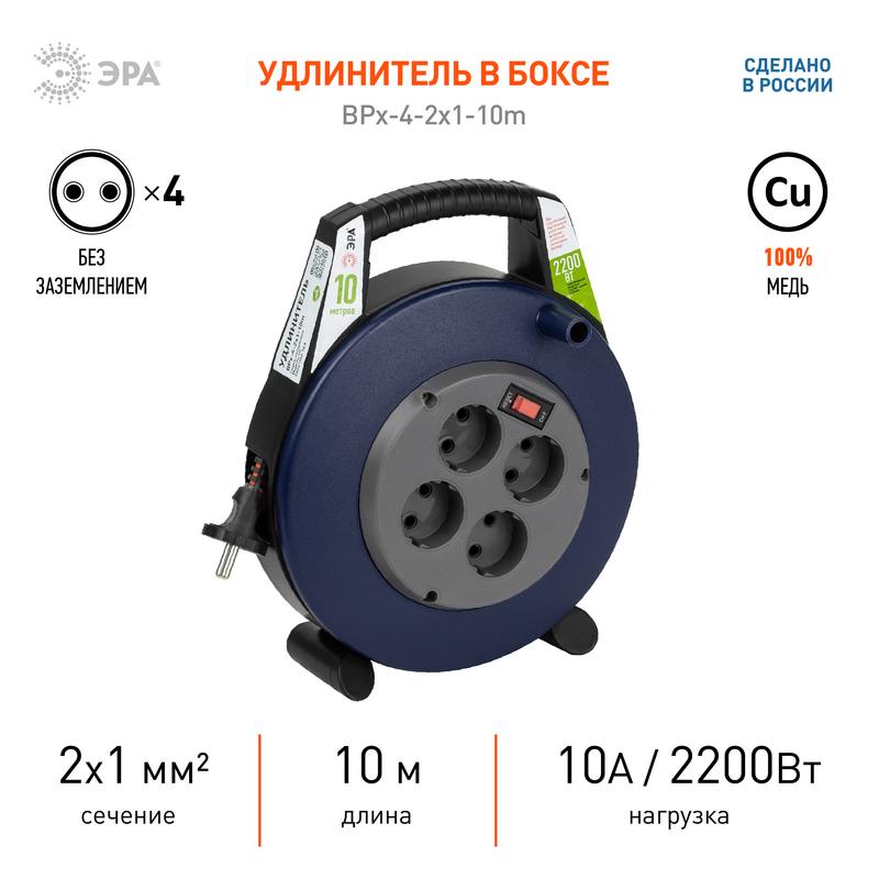 Силовой удлинитель ЭРА BPx-4-2×1-10m в закрытом корпусе без заземления, с выключателем, 4 розетки, 10м, ПВС 2×1мм2, 10А позволяет легко подключить удаленное на расстоянии от стационарной розетки электрооборудование суммарной мощностью до 2,2КВт. Закрытый корпус обеспечивает удобное и безопасное использование, а также хранение удлинителя. Удобная ручка позволяет легко передвигать удлинитель и устанавливать его в нужном для подключения месте.