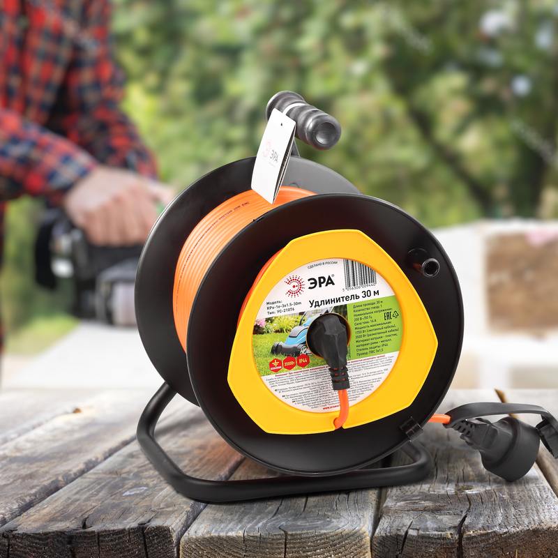 Удлинитель силовой на пластиковой катушке ЭРА RPx-1е-3×1.5-30m с заземлением, ПВС 3х1,5м2, 1 розетка, 30 м. Мощность 16А/3500Вт. Используется для работы на строительных площадках или дачных участках. Удобен при работе с приборами находящимися удаленно от стационарной розетки. Например, газонокосилки, электрические, пилы, триммеры или электродрели. Провод в удлинителях Эра сделан из 100% меди, что делает его абсолютно пожаробезопасным. Рама удлинителя сделана из высокопрочной стали а пластиковой корпус выполнен с применением негорючих добавок.