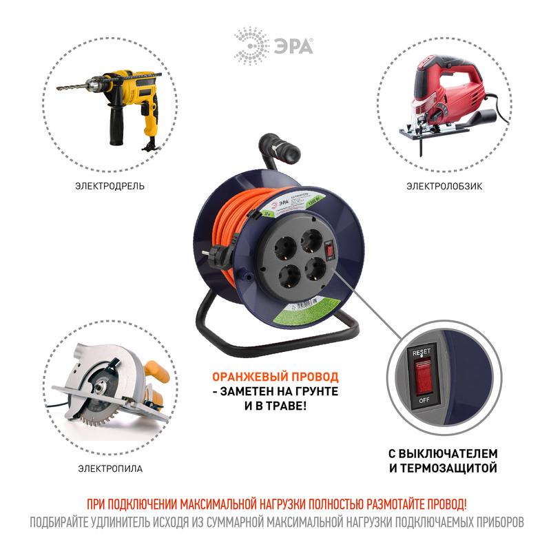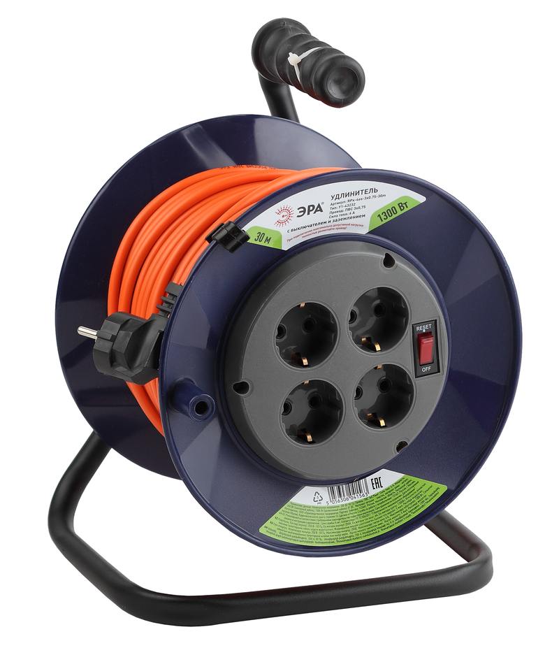 Удлинитель силовой на пластиковой катушке ЭРА RPx-4es-3х0.75-30m с заземлением, с выключателем, ПВС 3х0,75м2, 4 розетки, 30 м. Мощность 6А/1300Вт. Используется для работы на строительных площадках или дачных участках. Удобен при работе с приборами находящимися удаленно от стационарной розетки. Например, газонокосилки, электрические, пилы, триммеры или электродрели. Провод в удлинителях Эра сделан из 100% меди, что делает его абсолютно пожаробезопасным. Рама удлинителя сделана из высокопрочной стали а пластиковой корпус выполнен с применением негорючих добавок.