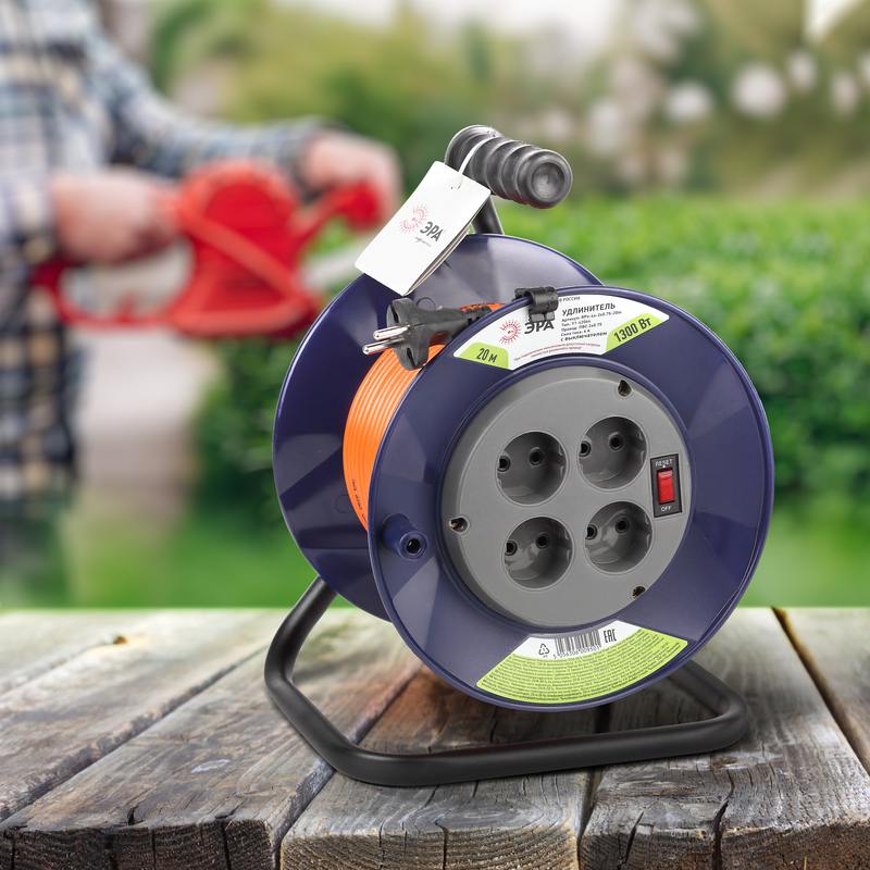 Удлинитель силовой на пластиковой катушке ЭРА RPx-4s-2×0.75-20m без заземления, с выключателем, ПВС 2х0,75м2, 4 розетки, 20 м. Мощность 6А/1300Вт. Используется для работы на строительных площадках или дачных участках. Удобен при работе с приборами находящимися удаленно от стационарной розетки. Например, газонокосилки, электрические, пилы, триммеры или электродрели. Провод в удлинителях Эра сделан из 100% меди, что делает его абсолютно пожаробезопасным. Рама удлинителя сделана из высокопрочной стали а пластиковой корпус выполнен с применением негорючих добавок.