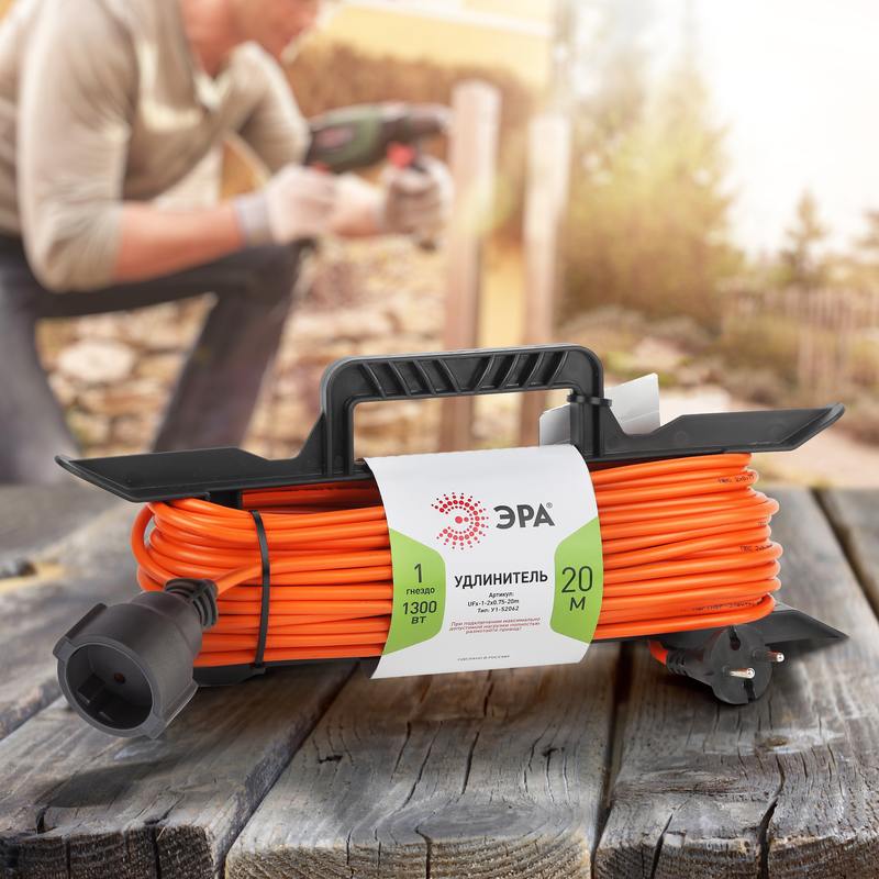 Удлинитель силовой на рамке UFx-1-2×0.75-20m на рамке без заземления 1 розетка, 20м ПВС 2×0.75мм2, степень защиты IP20. Мощность 6А/1300Вт. Используется для работы на строительных площадках или дачных участках. Удобен при работе с приборами находящимися удаленно от стационарной розетки. Например, газонокосилки, электрические, пилы, триммеры или электродрели. Провод в удлинителях Эра сделан из 100% меди, что делает его абсолютно пожаробезопасным. Рама-полипропилен.