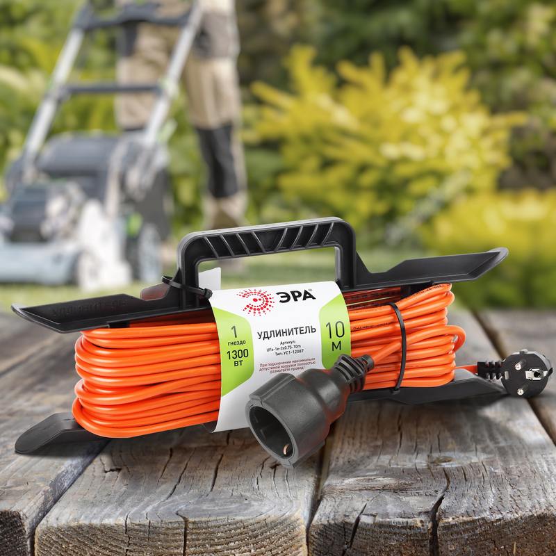 Силовой удлинитель на удобной рамке с ручкой, защищён от пыли и влаги. Длина шнура 10 метров. Позволяет работать с электроприборами на значительном расстоянии от сети. Максимальная нагрузка — 6 А / 1300 Вт. Надёжный трёхжильный провод по ГОСТу, гнездо имеет защитную каучуковую крышку. Отличное решение для строительных, ремонтных, дачных работ. Можно эффективно использовать при температурах от -25 до +40 °С. Рамка позволяет применять удлинитель с максимальным удобством шнур не спутывается, вы отматываете нужную вам длину.