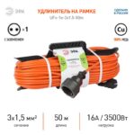 Удлинитель силовой на рамке UFx-1e-3×1.5-50m с заземлением, ПВС 3×1,5м2, 1 розетка, 50м, степень защиты IP20. Мощность 16А/3500Вт. Используется для работы на строительных площадках или дачных участках. Удобен при работе с приборами находящимися удаленно от стационарной розетки. Например, газонокосилки, электрические, пилы, триммеры или электродрели. Провод в удлинителях Эра сделан из 100% меди, что делает его абсолютно пожаробезопасным. Рама-полипропилен.