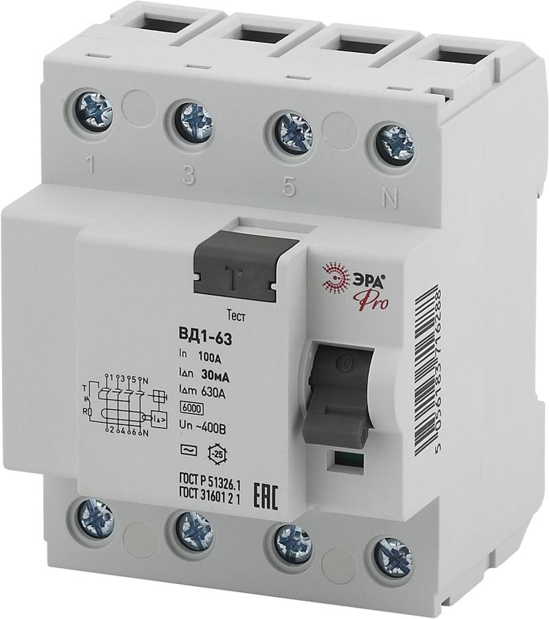 Характеристики УЗО ЭРА PRO NO-902-53 ВД1-63 4P 100А 30мА: