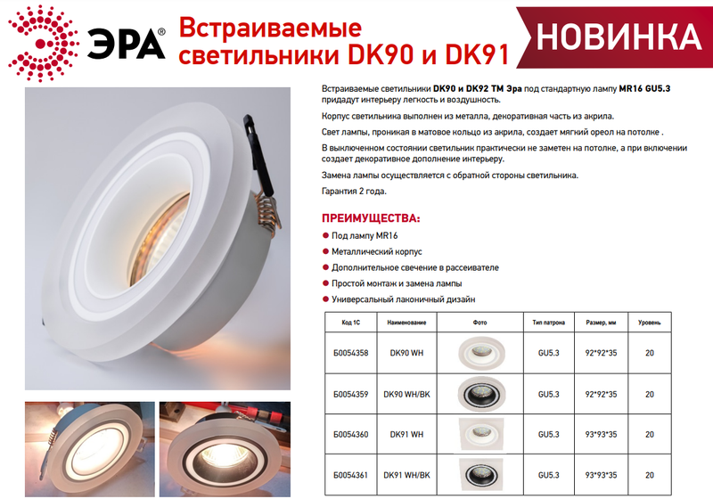 Светильник встраиваемый DK91 WH MR16/GU5.3 — отличный выбор для любого помещения в вашей квартире! Точечные светильники подходят как для основного освещения, так и для создания акцентов в определенных зонах комнаты. Благодаря скрытой части корпуса светильники можно встраивать не только в потолок, но и в стены, создавая разный стиль помещений. Светильник ЭРА с приятным дизайном подойдет для комнат с разным интерьером: от лофта до модерна, классицизма или минимализма. При помощи точечных светильников можно освещать только те участки помещения, которыми вы пользуетесь в данный момент, не затрачивая лишнюю элеткроэнергию. Максимальная мощность лампы составляет 50 Вт. Корпус встраиваемого светильника изготовлен из алюминия, что делает его особенно удобным и надежным в использовании. Диаметр отверстия, требуемого для установки светильника составляет 75 миллиметров, а размер корпуса светильника – 93x93x35 миллиметров. Цоколь под лампу GU5.3 входит в комплект. Купив точечный светильник бренда ЭРА, вы останетесь довольны и сможете создать приятную атмосферу и уют в Вашем доме! Внимание: лампа не входит в комплектацию.