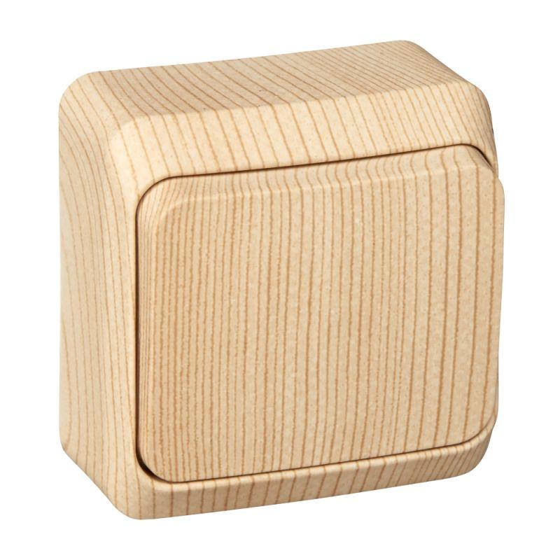 Выключатель ЭТЮД (сосна, открытой установки) одноклавишный предназначен для применения в сетях до 250В, на ток до 10А. Выключатель подходит для большинства типов ламп, включая люминесцентные. Изделия цвета Сосна обладают уникальным рисунком, напоминающим древесный сруб. Он прост в установке и удобен в применении. Сделано в России.
