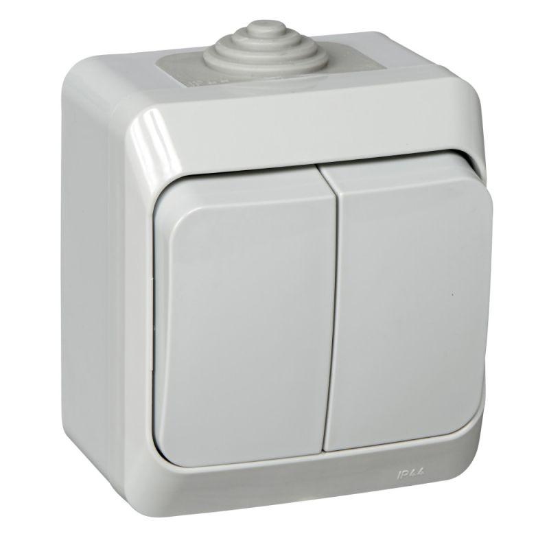 Выключатель ЭТЮД (серый, открытой установки) двухклавишный предназначен для применения в сетях до 250В, на ток до 10А. Выключатель подходит для большинства типов ламп, включая люминесцентные. Две клавиши позволяют управлять двумя источниками света с одной точки. Он удобен в применении и отлично подходит для ванной комнаты (IP44). Сделано в России.