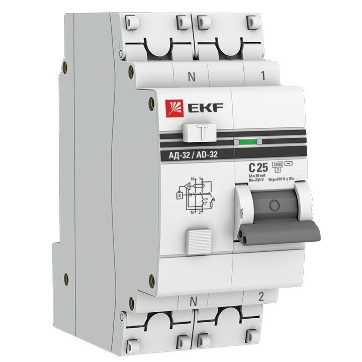 Характеристики Выключатель автоматический дифференциального тока 2п (1P+N) C 25А 30мА тип AC 4.5кА АД-32 2мод. защита 270В электрон. PROxima EKF DA32-25-30-pro: