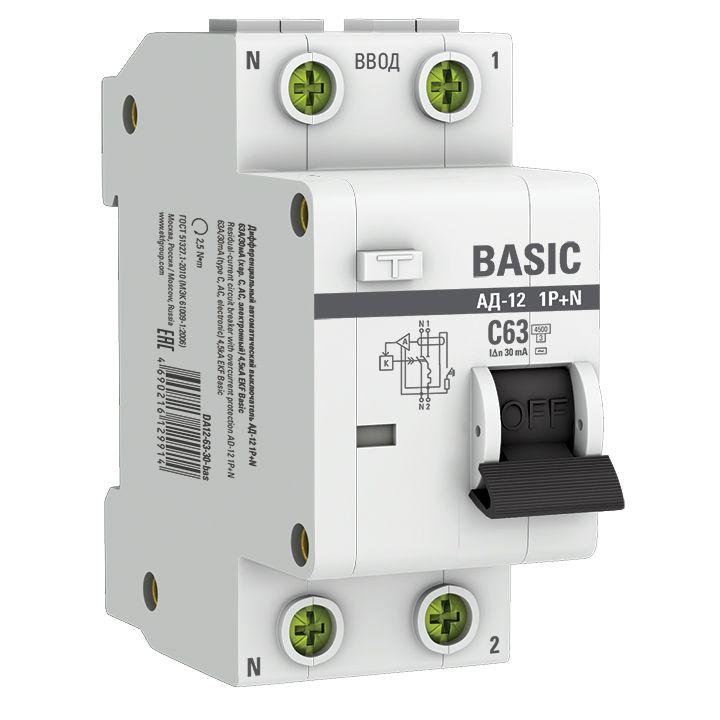Характеристики Выключатель автоматический дифференциального тока 2п (1P+N) C 63А 30мА тип AC 4.5кА АД-12 Basic EKF DA12-63-30-bas: