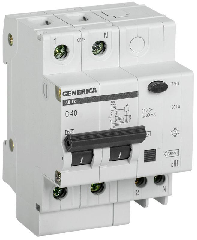 Характеристики Выключатель автоматический дифференциального тока 2п 40А 30мА АД12 GENERICA MAD15-2-040-C-030: