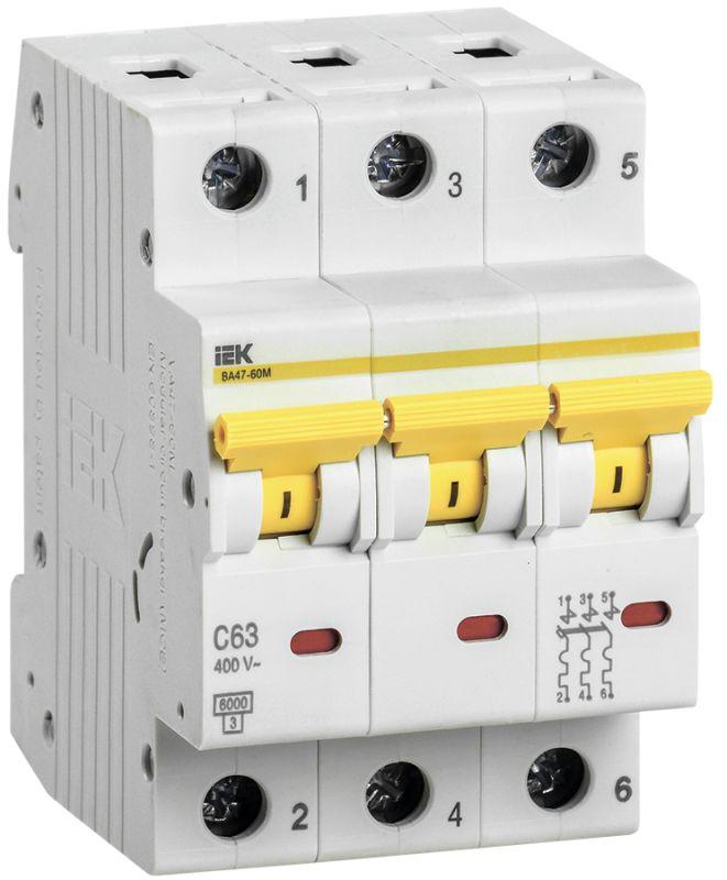 Характеристики Выключатель автоматический модульный 3п C 63А 6кА ВА47-60M IEK MVA31-3-063-C: