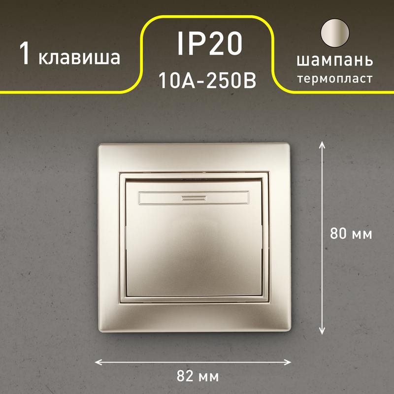 Характеристики Выключатель Intro Plano 1-101-04 одноклавишный, 10А-250В, IP20, СУ, шампань: