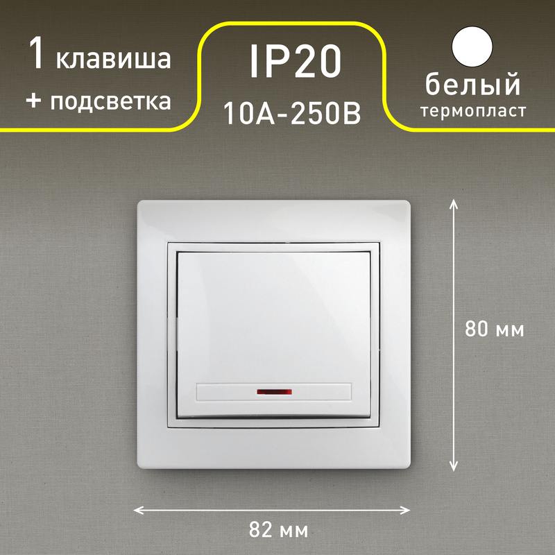 Выключатель одноклавишный с подсветкой, 10А-250В, IP20, СУ, белый Intro Plano 1-102-01