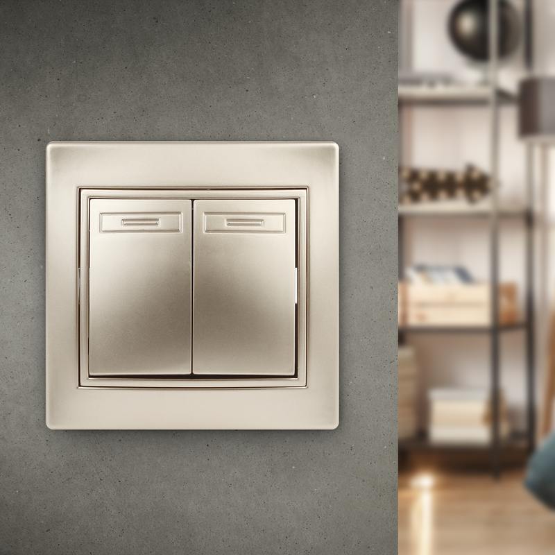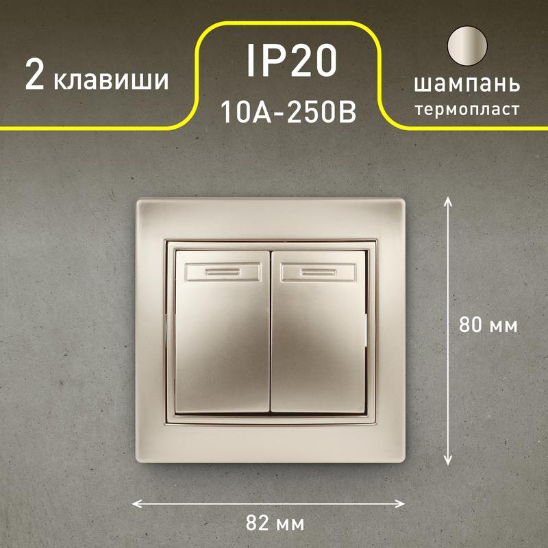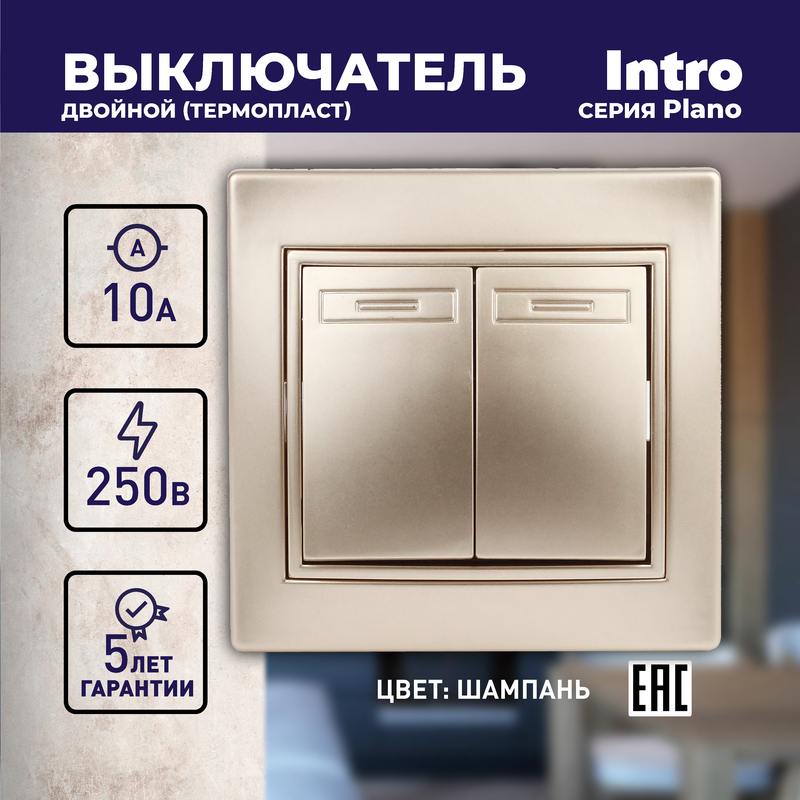 Характеристики Выключатель Intro Plano 1-104-04 двухклавишный, 10А-250В, IP20, СУ, шампань: